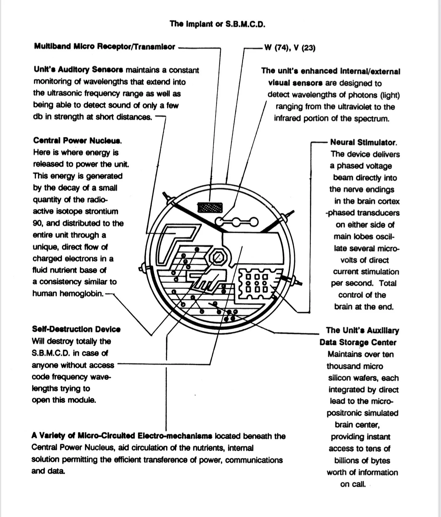 The S.B.M.C.D. or Implant - The Spherical Biological Monitoring and Control Device (SBMCD) is a techno-organic enhanced synapitid processor powered by a micro-positron flow that controls or mimics the functions of the human nervous system with micro-relay's duplicating the operations of brain engram patterns. Normally the Greys during an abduction make an insertion of a 3mm device (SBMCD) through the nasal cavity into more close proximity to the brain of the abductee and after implementing subliminal post hypnotic suggestions that could compel the abductee to perform some specific act within the next two (2) to five (5) years. Normally the SBMCD only can be removed when the abductee dies, trying to remove it while the abductee is alive means certain death.